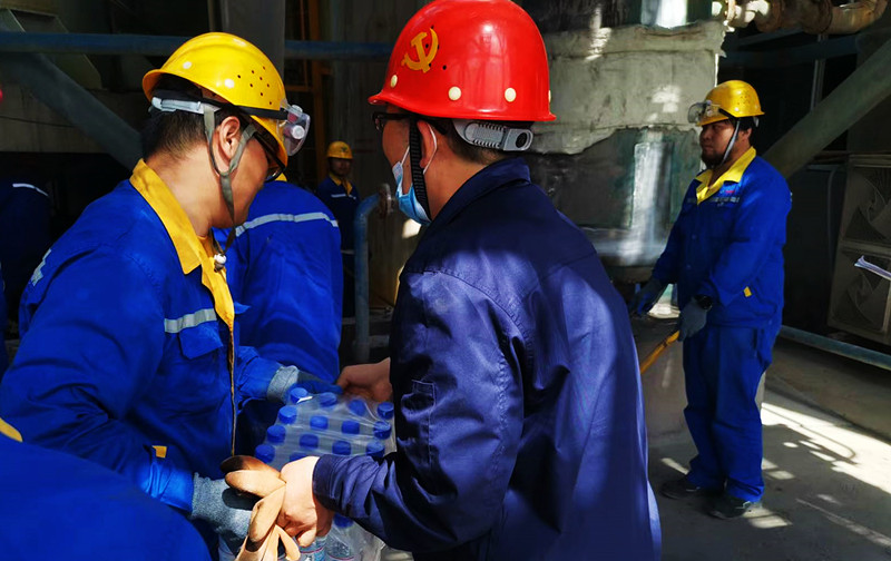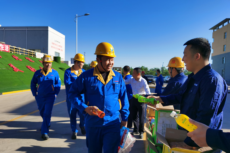 公司时刻关注现场高温高强度作业任务,考虑到现场饮水不便问题,机关单位人员主动服务,将一件件的瓶装水送入大家手中。