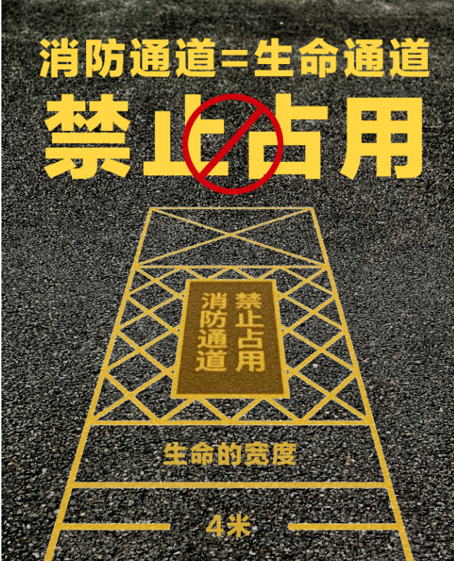 根据《中华人民共和国消防法》《中华人民共和国道路交通安全法》和国家标准《道路交通标志和标线》(GB 5768)的有关规定,对单位或者住宅区内的消防车通道沿途实行标志和标线标识管理。在消防车道路侧缘石立面和顶面应当施划黄色禁止停车标线;无缘石的道路应在路面上施划禁止停车标线,标线为黄色单实线,距路面边缘30厘米,线宽15厘米;消防车道沿途每隔20米距离在路面中央施划黄色方框线,在方框内沿行车方向标注内容为“消防车道 禁止占用”的警示字样(示例见图1)。在单位或者住宅区的消防车通道出入口路面,按照消防车通道净宽施划禁停标线,标线为黄色网状实线,外边框线宽20厘米,内部网格线宽10厘米,内部网格线与外边框夹角45度,标线中央位置沿行车方向标注内容为“消防车道 禁止占用”的警示字样(示例见图2);同时在消防车通道两侧设置醒目的警示标牌(示例见图3),提示严禁占用消防车道,违者将承担相应法律责任等内容。