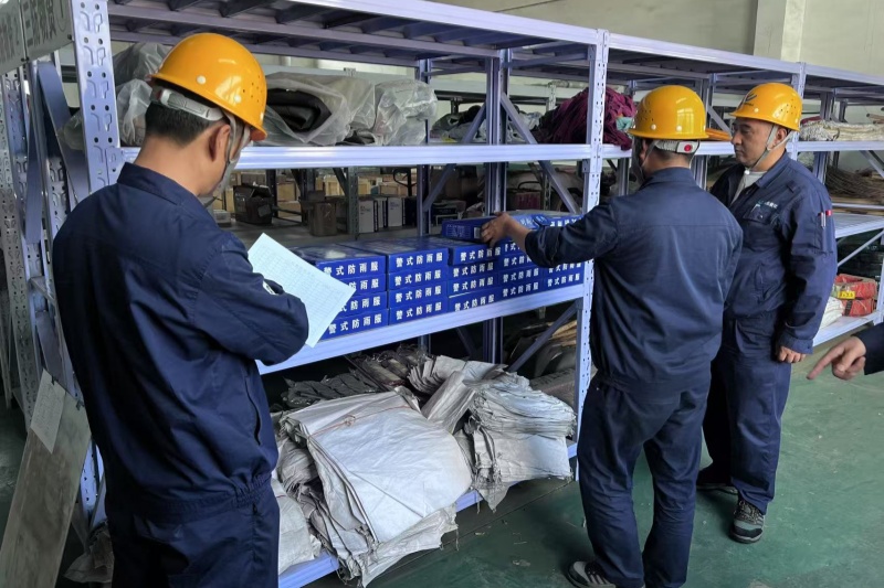 雨季“三防”物资是应对突发降雨天气的重要保障,检查小组对仓库内储备的雨季“三防”物资进行了全面盘点,包括沙袋、雨衣、雨靴、铁锹、潜水泵等。在盘点过程中,工作人员仔细核对物资的数量、规格和型号,检查物资的质量和性能是否符合要求,对于临时领用的或损坏的物资,检查小组及时通知生产技术部进行补充,确保雨季“三防”物资储备充足、完好有效。