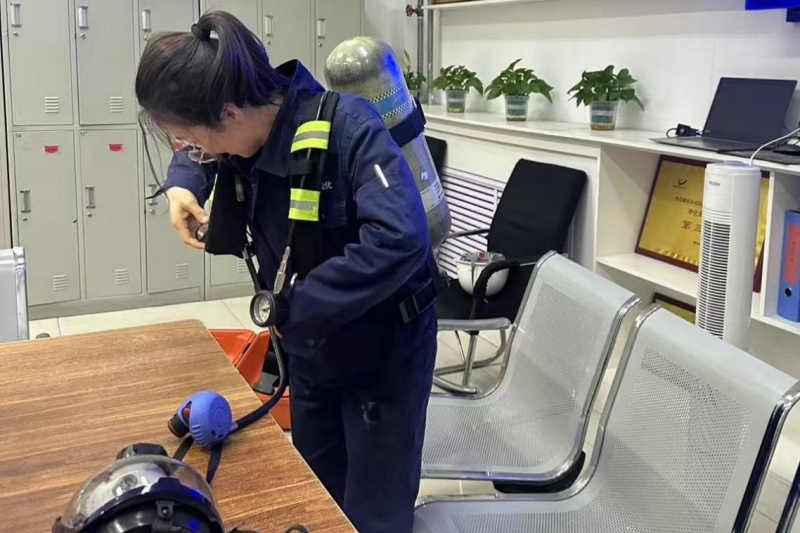 在实操环节,员工们分组进行灭火器扑灭模拟火情演练。随着“火情”燃起,参训员工迅速提起灭火器,按照操作规范冲向火源,冷静地拔掉保险销、对准火焰根部喷射,成功将模拟火势扑灭。在空气呼吸器穿戴实操中,员工们两两一组,相互配合练习。从检查气瓶压力、连接管路,到快速佩戴面罩、调整肩带,大家严格按照流程操作。