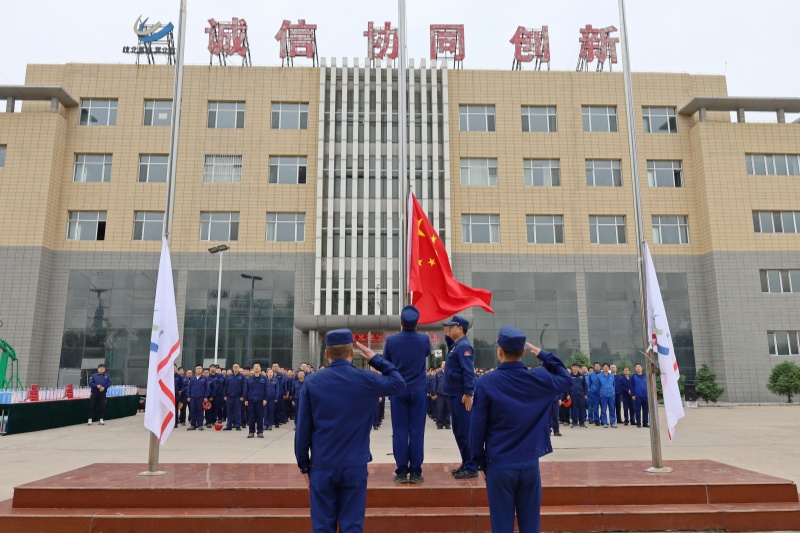 在雄壮的《义勇军进行曲》和激昂的《皖煤之歌》中,国旗、皖北煤电旗冉冉升起,全体人员行注目礼,庄严肃穆。