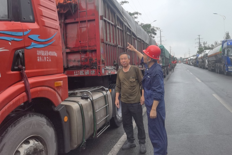 销售采购部员工向司机介绍煤炭防雨的必要性