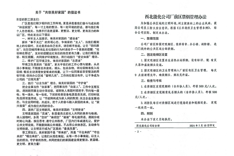 为进一步营造整洁文明、健康有序的厂区环境,增强职工家园意识与文明规范意识,10月9日下午西北能化公司组织开展 “共创美好家园” 倡议书及《西北能化公司厂前区禁烟管理办法》宣讲活动,引导职工积极参与家园建设、严守禁烟规定。