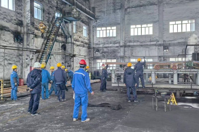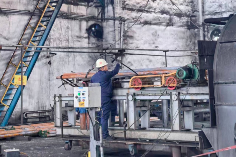 车间内,棒磨机如钢铁巨兽静立,而围绕其展开的钢棒装填工作却热火朝天。车间主任和安全员始终坚守一线,从钢棒的吊运规划到装填节奏的把控,事无巨细地进行协调与指挥。他们深知棒磨机的稳定运行对后续生产的关键作用,每一次钢棒的精准摆放,每一个环节的衔接调度,都凝聚着他们对生产流程的深刻理解与对工作的严谨态度。在他们的统筹下,装填工作有序推进,为设备的高效运转筑牢了基础。