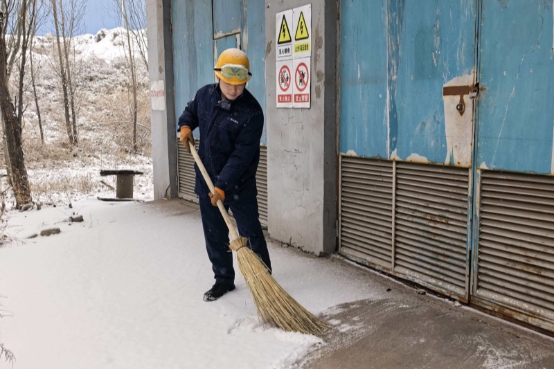 当天一大早,电气车间员工在完成交接班后,迅速按照车间统一部署,携带铁锹、扫帚等工具,对各配电室门口、巡检通道的积雪进行全面清扫。大家分工明确、配合默契,有的负责铲除厚雪,有的负责清扫残雪,忙得热火朝天。