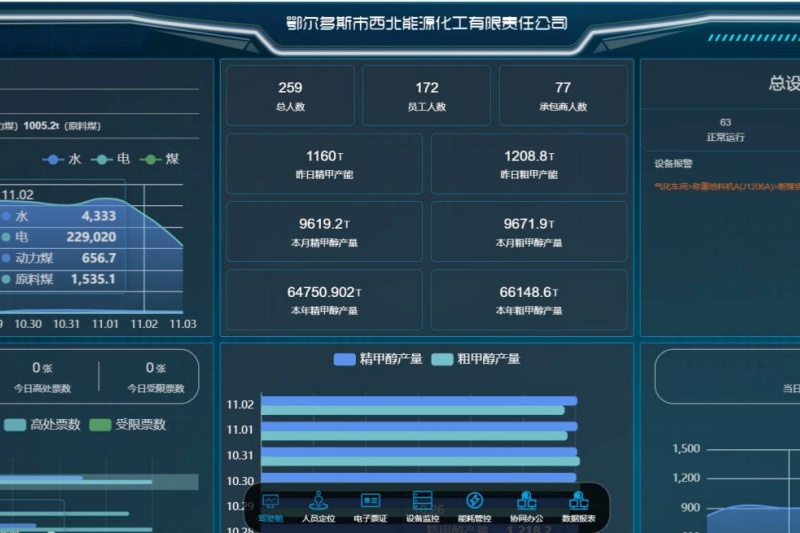 事故隐患排查治理,关键在“查”,重点在“治”,根本在“防”。公司把“防”摆在第一位,在“防”上下功夫,公司发挥科技力量,建立大数据信息化平台,通过统一接口与可视化看板,整合人员定位、电子票证、能耗监测、产能统计、设备监控、视频监控六大模块,确保现场情况“一手掌握”。实时人员定位+危险区域电子围栏,降低安全风险,高效提升人员利用率。将作业票全流程电子化,审批时长大幅缩减,与人员定位联动,合规性显著提升。实时采集能源数据,产能进度实时更新,便于管理和决策。对设备关键参数实时监控、异常报警,随时可查现场视频,形成“感知—评估—预警—处置”全链条智能防控能力,实现对全要素风险的精准管控,增强安全保障能力。