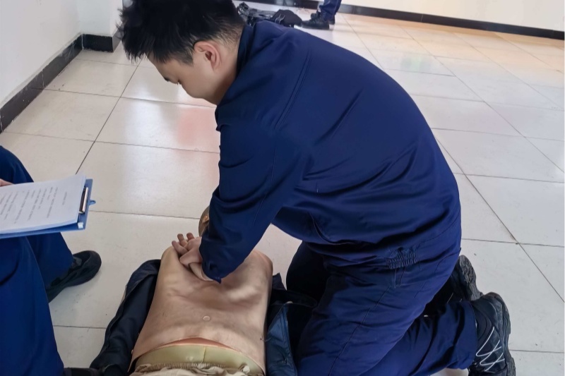 人工呼吸急救考核环节,模拟员工在作业中突发昏厥、呼吸停止的紧急场景。参训员工迅速反应,按照“判断意识、开放气道、人工呼吸”的标准流程展开急救,规范完成仰头抬颏、口对口密封吹气等操作,展现出扎实的急救知识储备与熟练的实操技能。考官通过现场提问、动作纠正等方式,强化员工对急救流程的记忆,强调“黄金急救时间”的重要性,确保在真实突发情况中能够快速响应、科学处置。