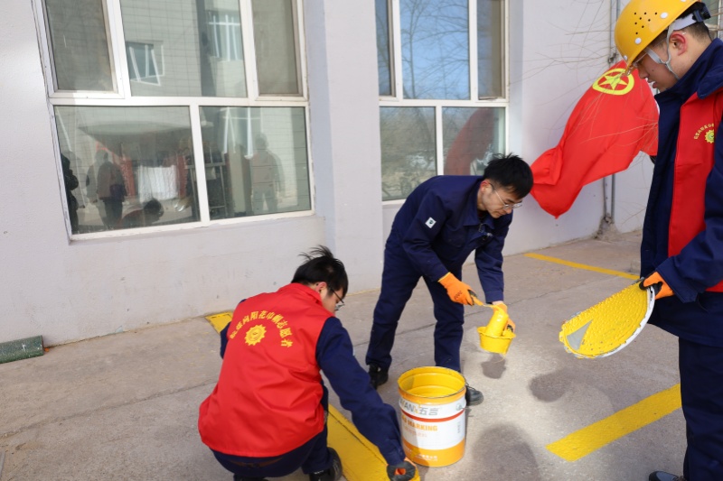 规范停车,划线立标。针对食堂门口自行车停放区无标识、车辆摆放杂乱的问题,志愿者们手持油漆、滚刷、标尺等工具,默契配合,定点、拉线、粉刷,很快划出一道道规范醒目的停车线,有效引导员工有序停放。