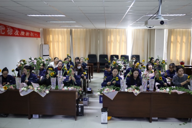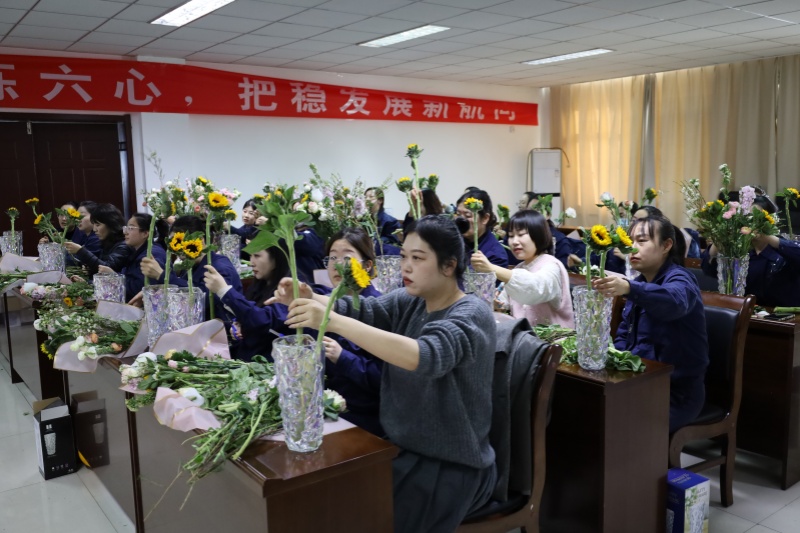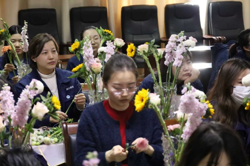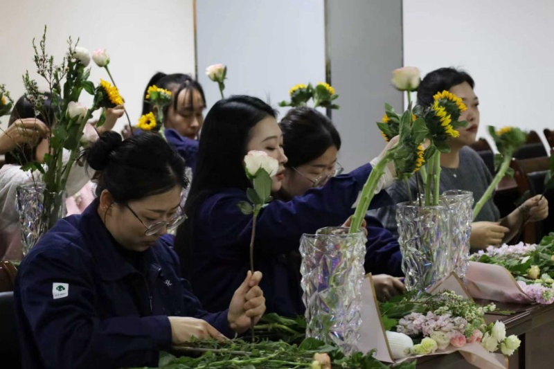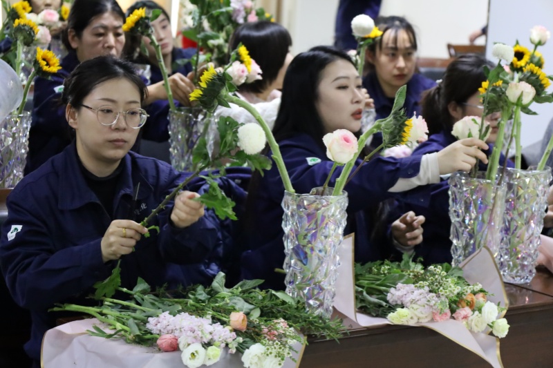 会议室里,洛神玫瑰娇艳、康乃馨温婉、洋牡丹层叠、向日葵明媚、乒乓菊圆润、腊梅清幽……各色花材风姿各异,将现场装点得生机盎然。近40名来自生产一线和机关部室的女职工暂卸工装、放下报表,在这个专属节日里,与鲜花共赴一场春日之约。