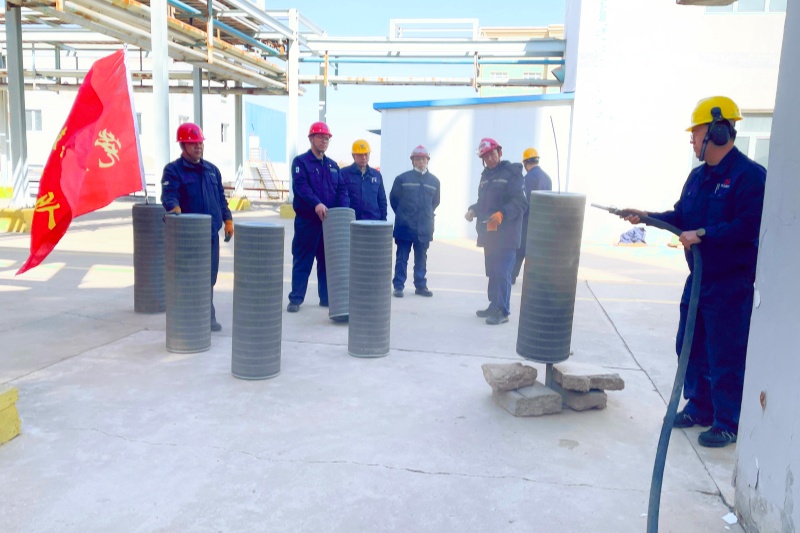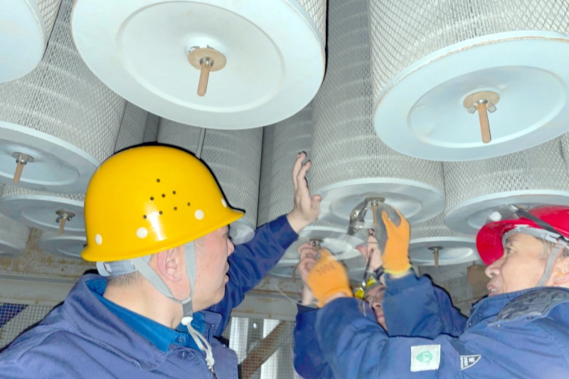 随后,党员骨干冲锋在前、协同配合,严格按规程完成滤筒拆卸、安全吊装、彻底吹扫、精准回装等工序,高效清除设备积尘,有效降低吸入口阻力、减少能耗损耗,切实提升装置运行效率。