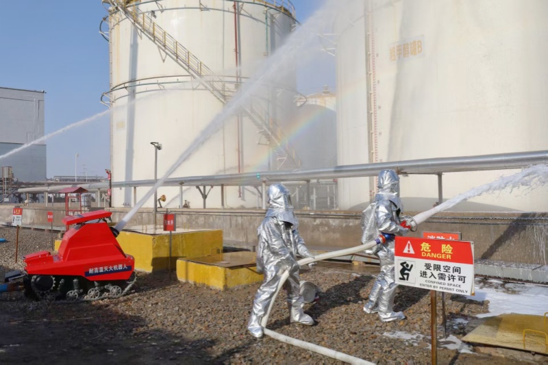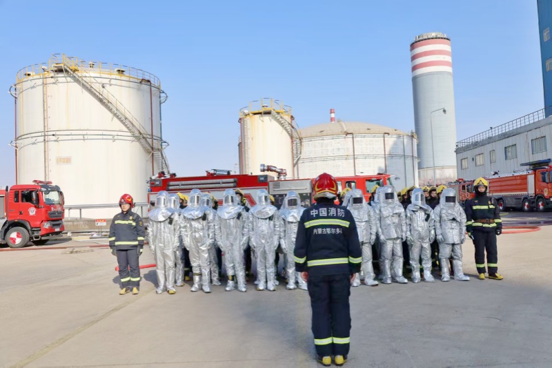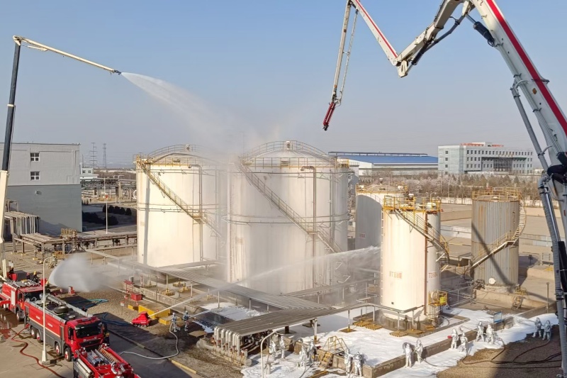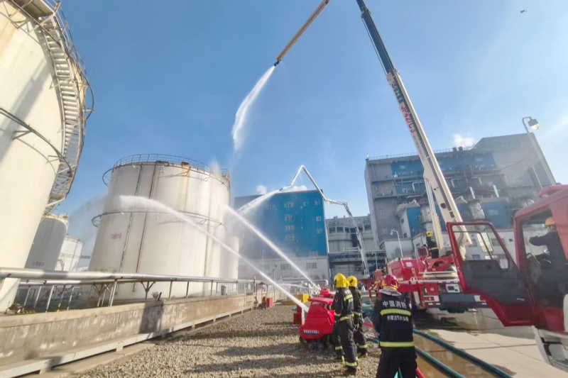 为深刻吸取近期各类安全事故教训,进一步提升消防救援队伍应对危险化学品火灾事故的快速响应与攻坚打赢能力。3月26日,园区消防救援站充分利用我公司场地优势,模拟罐区甲醇泄漏引发火灾,开展了一场以“快速灭火、科学处置”为核心科目的实战化演练。