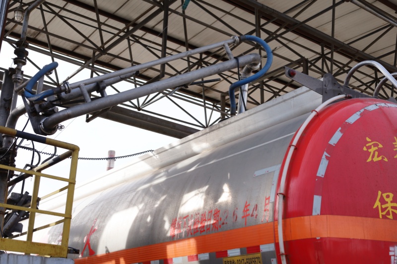 在甲醇装车区,一辆辆罐车排成长龙,等待装货。灌装人员穿梭其间,协调车辆进出、核对订单信息、监督装车作业,忙得不亦乐乎。