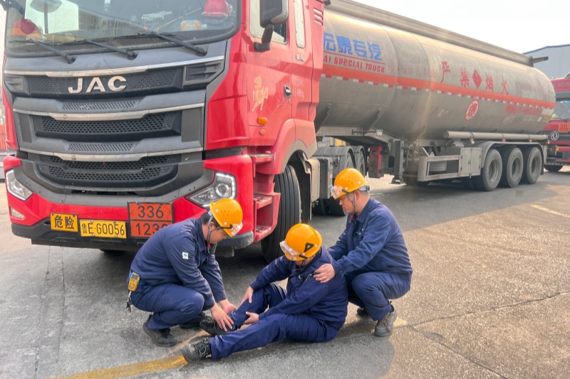 本次演练模拟罐装平台内一辆转运车辆在行车过程中因操作失误撞伤一名作业人员。演练严格按照事故报告、应急启动、警戒疏散、抢险排险、医疗救护、伤员转运及现场恢复等环节展开。演练开始后,现场立即启动应急响应机制,参演人员迅速进入状态,肇事驾驶员立即停车呼救,通讯联络组第一时间上报,总指挥果断启动应急预案,警戒疏散组随即拉设警戒带、封锁现场,抢险救援组使用三角木固定车辆并排查罐区泄漏风险,医疗救护组对“伤员”进行止血包扎与骨折固定,各应急小组迅速集结、分工协作。